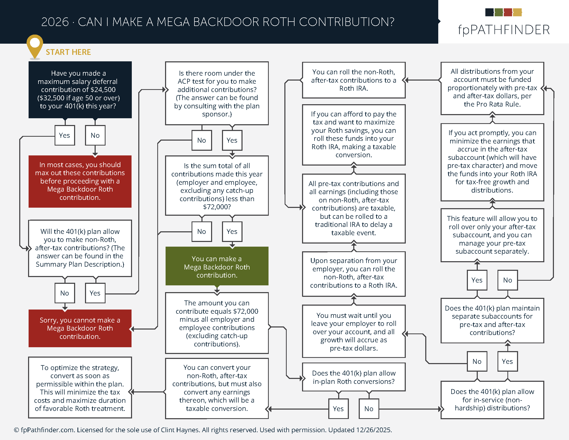 However, not everyone can do this. There are strict guidelines and several steps needed to make a “mega” Roth conversion. The flowchart below (not as complex as it looks) outlines the questions you need to answer to determine whether you can complete a mega backdoor Roth conversion.