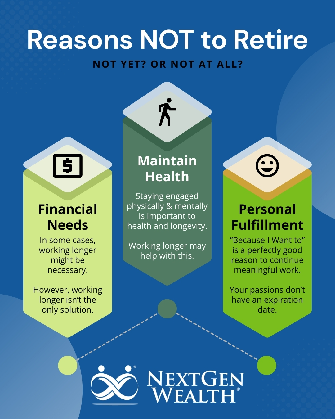 NextGen Wealth can assist you in building a plan to maximize your retirement – even if you never really "retire" in the traditional sense. We specialize in the transition into retirement and continue with you throughout your journey in life.